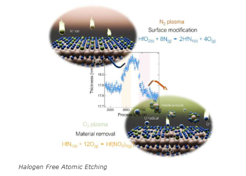 मिंग ची यूनिवर्सिटी ऑफ टेक्नोलॉजी के सहयोग से नागोया विश्वविद्यालय के शिह-नन हसियाओ और मसरू होरी के नेतृत्व में टीम ने एक दो-चरणीय चक्रीय विधि तैयार की, जो नाइट्रोजन और ऑक्सीजन प्लास्मा के साथ हैलोजेन की जगह लेती है।पहले चरण में, N⁺ आयन HFO2 सतह पर बमबारी करते हैं, फिल्म के लिए नाइट्रोजन को बॉन्ड करते हैं।दूसरे में, एक O2 प्लाज्मा एक आत्म-सीमित प्रतिक्रिया के माध्यम से नाइट्रोजन-बंधुआ परत को दूर करता है।प्रत्येक चक्र सामग्री के सिर्फ 0.023 से 0.107 नैनोमीटर को हटा देता है, जिससे सबटोमिक सटीकता सक्षम होती है।
